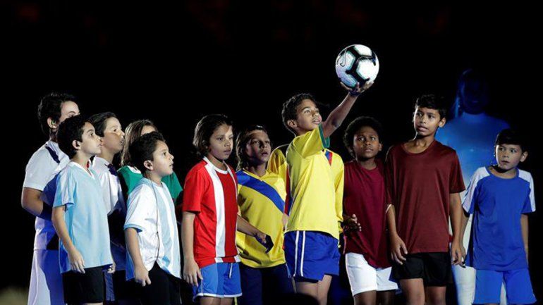 Más de 400 personas, muchos de ellos niños, salieron al césped del Morumbí representando a cada uno de los doce países que participan en esta Copa América y bailaron hasta reunirse todos juntos en el centro.