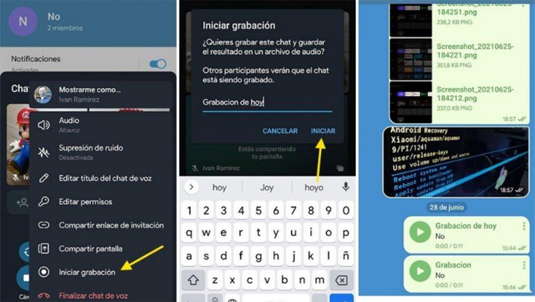 a grabación sólo incluye el audio, al menos por el momento. Para grabar una videollamada grupal de Telegram debes usar el menú y pulsar Iniciar grabación. Si quieres, puedes indicar un nombre para tu grabación.