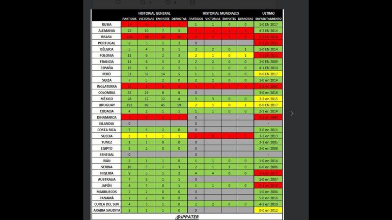 La Selección solo tiene historial negativo ante cuatro equipos (Rusia, Brasil, Inglaterra y Dinamarca) contando todos los enfrentamientos y frente a la misma cantidad si se toman solo los cruces en los Mundiales (alemanes, brasileros, ingleses y suecos). Contra 12 de los conjuntos clasificados, todavía no hubo encuentros mundialistas.