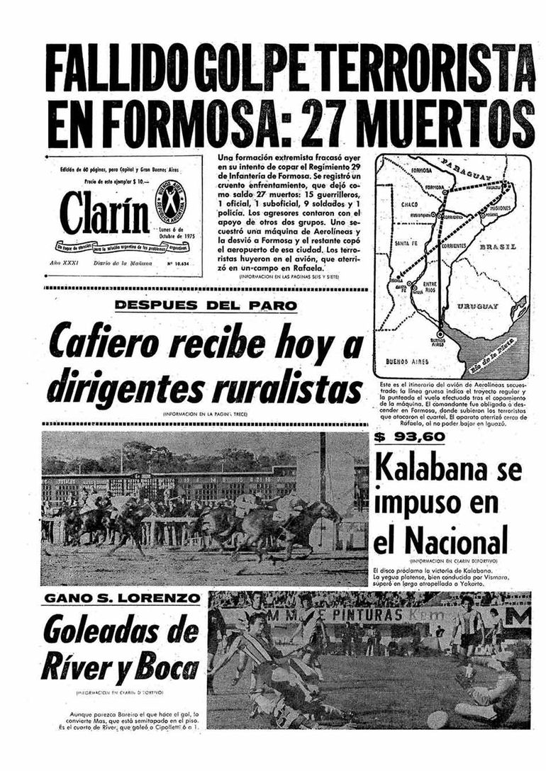 El 5 de Octubre, Montoneros asalta el Regimiento 29 de Formosa, con el luctuoso saldo de veinte muertos: once soldados y nueve guerrilleros. Es su declaración de guerra al ejército. La Opinión titula: “El país en guerra” con un mapa de Argentina mostrando los distintos puntos donde hubo atentados.