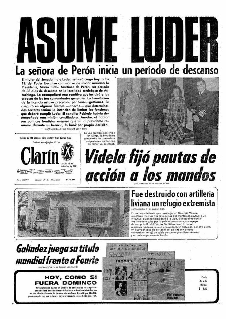 La prolongada licencia de Isabel abre un espacio de duda sobre su regreso al gobierno. Desde varios sectores se alimenta la idea de que el interinato de Luder se convierta en permanente. La Opinión titula en tapa: “Al extender la licencia se busca afirmar el proceso”. “La incógnita de la salud presidencial”. “Los altos mandos prevén licencia más amplia”.