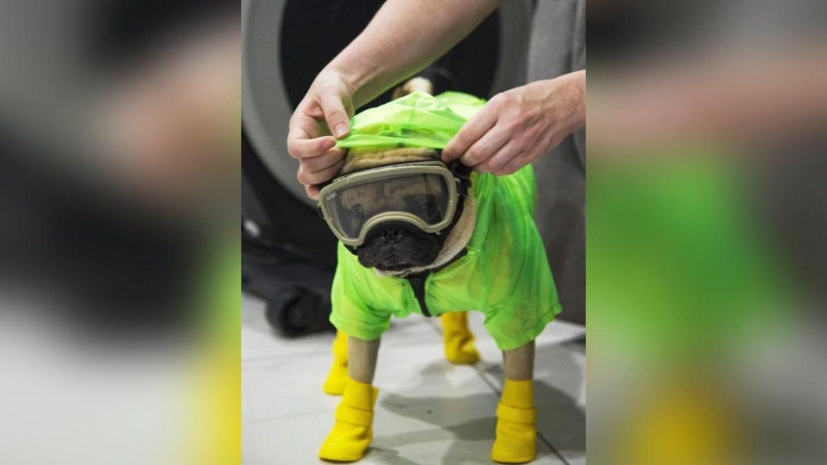 Quienes también se preparan son las mascotas, como ésta en Estados Unidos, con una particular indumentaria para prevenir el coronavirus.