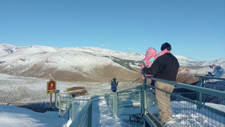 Sin embargo, este invierno que ha sido bendecido por las nevadas en Las Ovejas, le imprime un valor agregado al mirador. El domingo pasado la familia de la pobladora local Susana Méndez, se acercó a visitar este mágico atractivo turístico y lo recorrió de punta a punta para disfrutar de la nieve y de las magníficas vistas que proporciona el manto blanco sobre las montañas y en especial el “vigía eterno”, que es el Volcán Domuyo, el techo de la Patagonia.