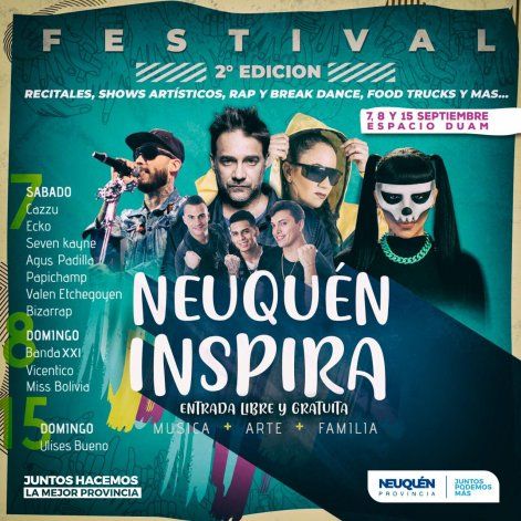 Se trata de la segunda edición de esta propuesta con formato de festival musical que organiza el gobierno de la provincia y que invita a un momento de encuentro con amigos y familia. Las jornadas contarán, además de los recitales, con producciones urbanas, foodtrucks, espacios deportivos, stands institucionales y un sector de emprendedores. La primera edición de Neuquén Inspira se llevó a cabo a mediados de febrero de este año y convocó más de 80 mil personas en el predio.