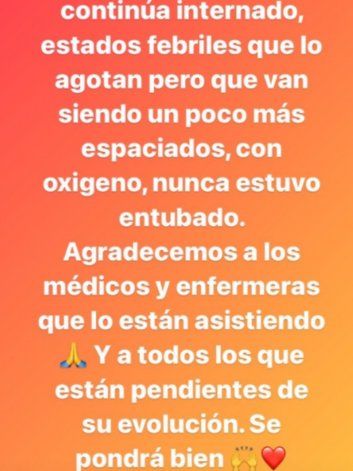 Silvia también contó que su marido es asistido “con oxígeno”, pero que “nunca estuvo entubado”. Por otro lado, la mujer del periodista aprovechó su posteo para dirigirse al personal de salud y se mostró muy optimista respecto a la recuperación del conductor. “Agradecemos a los médicos y enfermeras que lo están asistiendo. Y a todos los que están pendientes de su evolución. Se pondrá bien”, concluyó.