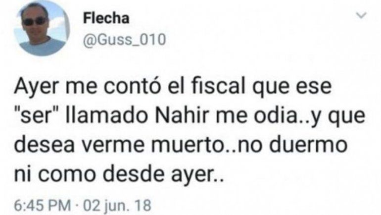 Unos días antes del inicio del juicio, el padre de Fernando hizo una acusación más grave: advirtió que Nahir quiere "verlo muerto". El posteo, que fue eliminado del perfil después, fue capturado y publicado por el sitio entrerriano diarioactualizado.com.