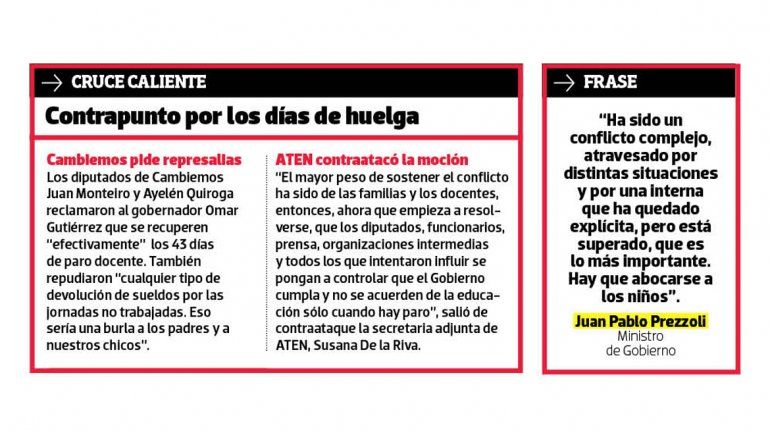 El gobernador Omar Gutiérrez declaró a los medios que impulsará una extensión del ciclo lectivo para recuperar las clases perdidas, que podría incluir “la reducción o eliminación del receso de invierno”. También aseguró que recién a esta altura del año pudo hacer una proyección “macroeconómica” para ampliar la oferta salarial hasta 2019, como pedía ATEN.
