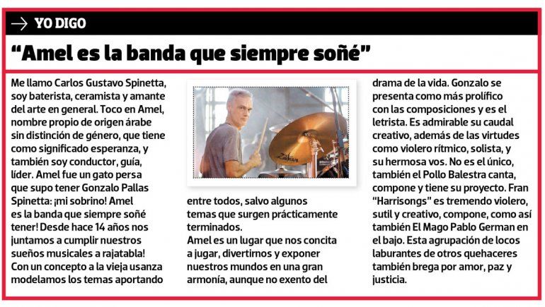 Para mí es un proceso natural en el tiempo. Amel es mi primera banda, mi primer disco, canción y grabación. Salíamos del colegios y en la casa de mi abuelo estaba la batería armada, todo, y comenzábamos a zapar. Todo arrancó jugando entre música y hace años que tocamos con compañeros de colegio, salvo mi tío Gus (Gustavo Spinetta) que estuvo siempre cerca. Amel va adquiriendo una evolución natural y eso hace que vayas mejorando como músico. Creo que Las cosas pasan (último disco) tiene esa madurez.
