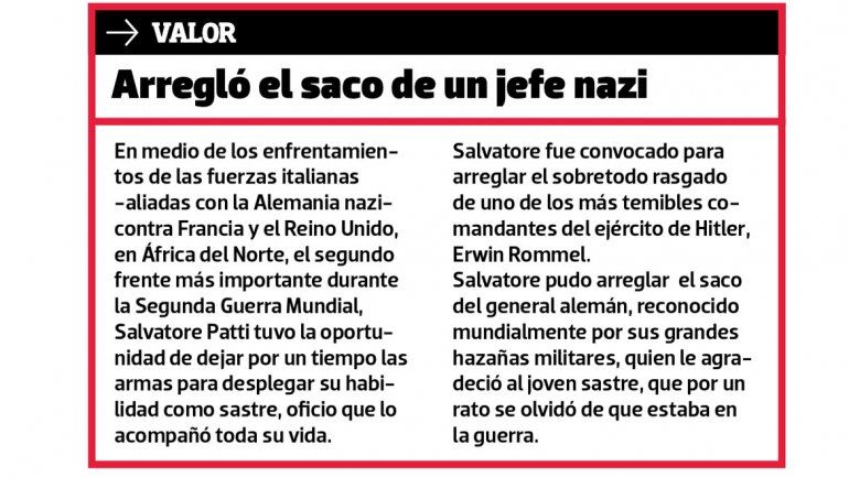 Salvatore combatió en África, donde tuvo un particular contacto con uno de los jefes nazis más reconocidos por sus hazañas guerreras (ver aparte). Luego de la contienda bélica, Salvatore llegó a la Argentina, donde abrió su sastrería.
