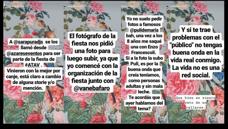 Ante esa respuesta, La China mostró las garras. “A Puli Demaria se la llamó desde @Azareseventos, para ser parte de la fiesta de ATAV. Vinieron con la mejor por canje, a cambio de alguna storie y/o mención. El fotógrafo de la fiesta nos pidió una foto para luego subir, ya que yo comencé con la organización de la fiesta junto a Vanesa Bafaro (encargada de prensa de El Trece y Pol-ka)... Si te trae problemas con el público no tengas buena onda en la vida real conmigo. La vida no es una red social”.