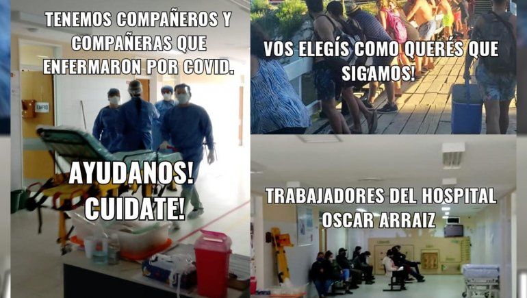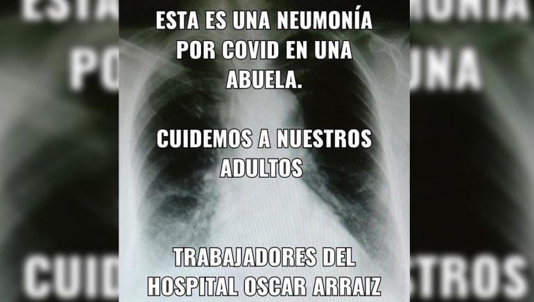"Tenemos compañeros y compañeras que enfermaron por Covid. Cuidanos. Cuidate", pide una de las imágenes. "Esta es una neumonía por Covid en una abuela. Cuidemos a nuestros adultos mayores", exhibe otro afiche con la foto de una radiografía pulmonar.