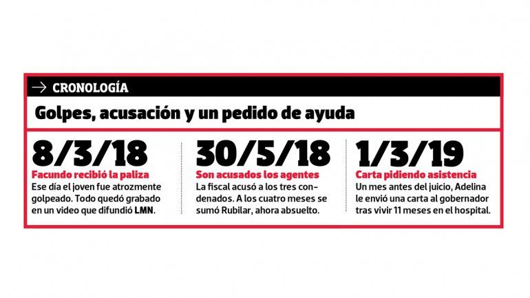 Neuquén. “Acá estábamos yendo contra el poder, contra la Policía, y es algo muy grande. Tengo muchas preguntas sin respuestas”, confió entre lágrimas Adelina Rivas, la mamá de Facundo Agüero, tras conocer el fallo que condenó a tres de los policías acusados de haber golpeado a su hijo. El oficial restante fue absuelto por los jueces.