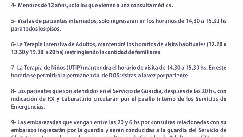 En este sentido, explicó que el operativo incluye impedir el acceso a menores de 12 años que sólo podrán entrar si deben ser atendidos en emergencias o por consulta medica. Además, se pidió que en caso de consulta, los niños sean atendidos en los centros de salud barriales. No podrán asistir a ver familiares internados.