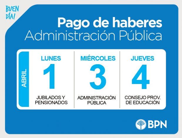 El ministerio de Economía e Infraestructura informó que los empleados estatales de Neuquén cobrarán sus haberes el lunes 1, el miércoles 3 y el jueves 4 de abril.