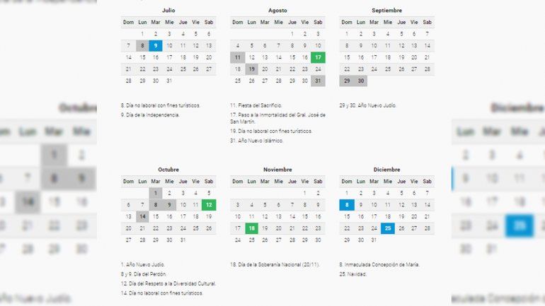 Según lo reglamentado por el Gobierno Nacional, el calendario 2019 tendrá 12 feriados inamovibles por fechas patrias, carnaval y algunas celebraciones religiosas, más cuatro que se trasladan para generar un total de ocho fines de semana largo.