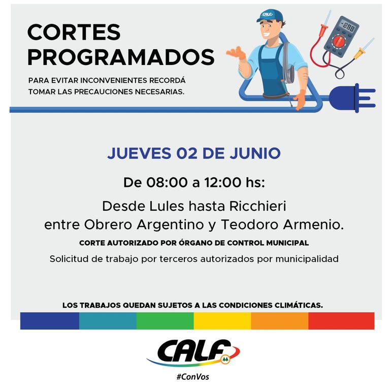 El jueves, en tanto, personal de la cooperativa hará trabajos por pedido de terceros a la Municipalidad en la zona comprendida desde Lules y Richieri, entre Obrero Argentino y Teodoro Armenio. El corte de servicio tendrá lugar de 8 a 12.