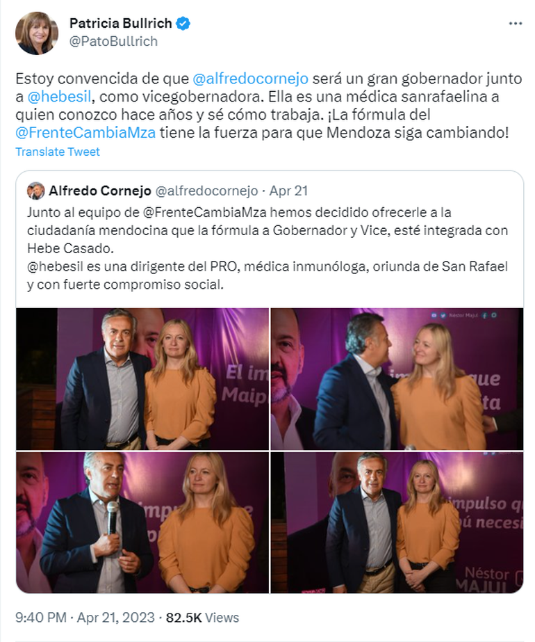 “Junto al equipo del Frente Cambia Mendoza hemos decidido ofrecerle a la ciudadanía mendocina que la fórmula esté integrada con Hebe Casado. Ella es una dirigente del PRO, médica inmunóloga, oriunda de San Rafael y con fuerte compromiso social”, anunció uno de los líderes de la Unión Cívica Radical a través de su cuenta oficial de Twitter.