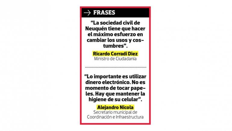 El ministro de Ciudadanía, Ricardo Corradi Diez, y el secretario de Coordinación e Infraestructura de la Municipalidad de Neuquén, Alejandro Nicola, fueron ayer los voceros del gobierno provincial y del municipio para concientizar a los neuquinos sobre la importancia de cumplir con el protocolo que dispuso el gobierno nacional.
