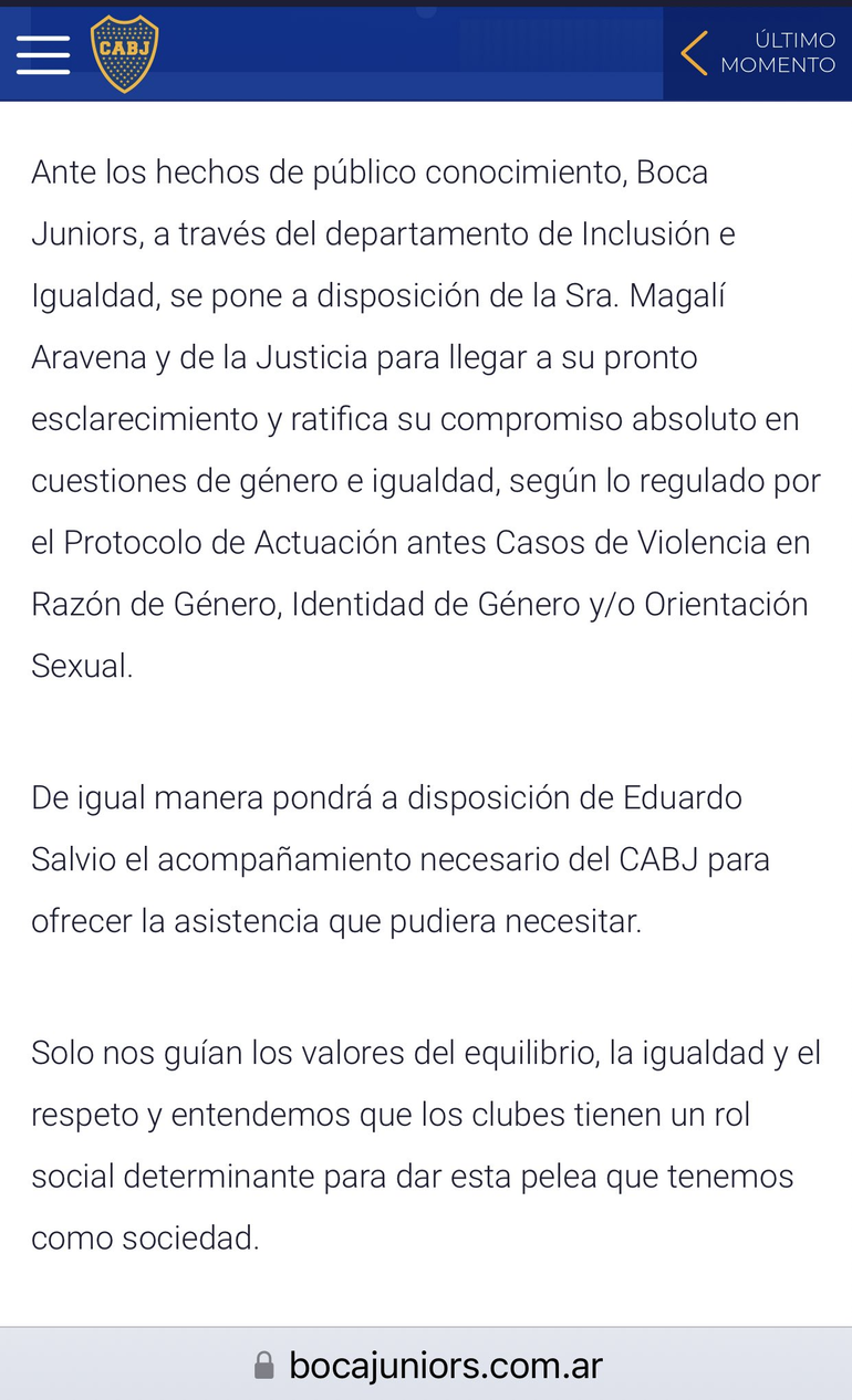 "Ante los hechos de público conocimiento, Boca Juniors, a través del departamento de Inclusión e Igualdad, se pone a disposición de la Sra. Magalí Aravena y de la Justicia para llegar a su pronto esclarecimiento y ratifica su compromiso absoluto en cuestiones de género e igualdad, según lo regulado por el Protocolo de Actuación antes Casos de Violencia en Razón de Género, Identidad de Género y/o Orientación Sexual", expresa un comunicado de prensa difundido esta tarde.