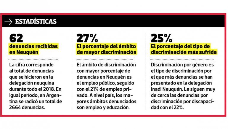En Neuquén, por ejemplo, el tipo de discriminación más denunciado durante el 2018 fue por género (con el 25%), seguido de cerca por discapacidad (22%).