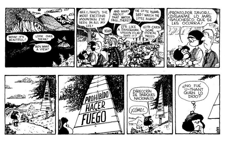 Las tiras muestran el cartel de la estación de Zapala el interior de un hospedaje, un catango cargado de leñas, un cartel de parques nacionales. Al final de la tira, Mafalda, ya de regreso, le muestra a Miguelito, uno de los personajes de la pandilla de niños que formaba parte de las tiras, una fotografía junto a un árbol y le dice: “Fueron una vacaciones maravillosas, Miguelito”.