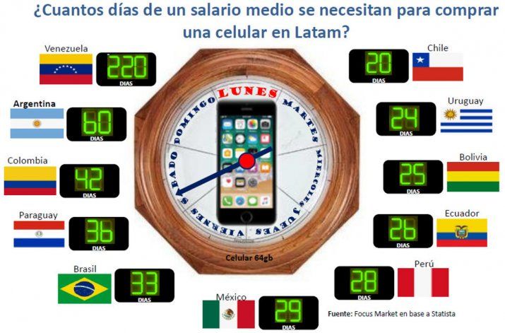 La brecha se amplía en el caso de un celular de 64 GB, para cuya compra un argentino debe trabajar 60 días contra 220 de un venezolano pero 36 de un paraguayo, 33 de un brasileño, 25 de un boliviano, 24 de un uruguayo o 20 de un chileno.