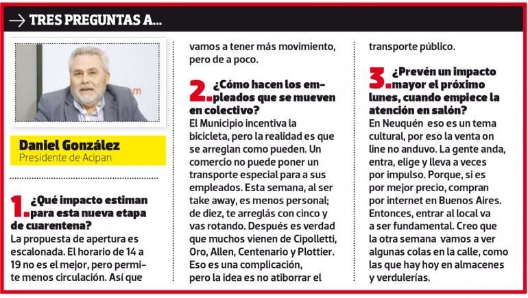 En el conglomerado de Neuquén, Plottier y Centenario, ayer comenzó la venta de comercios minoristas con retiro en puerta o "take away", mientras que los salones de estética empezaron a recibir clientes con turnos reducidos. En el sector gastronómico, desde el miércoles pasado pueden entregar comida en el local y el delivery se extendió hasta las 22.