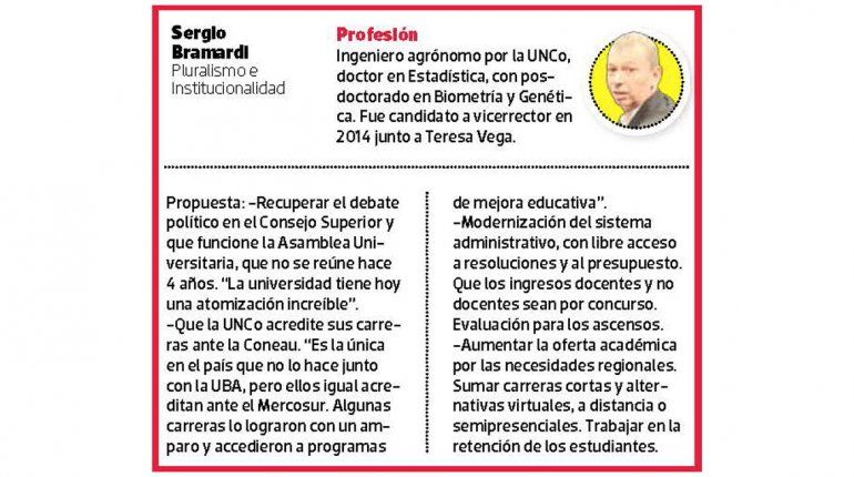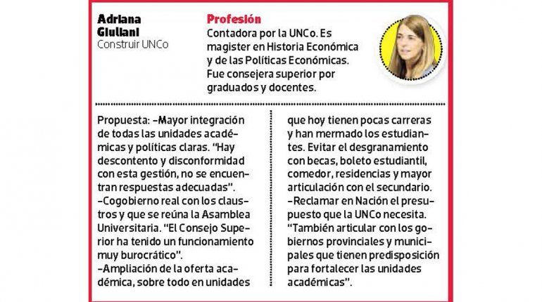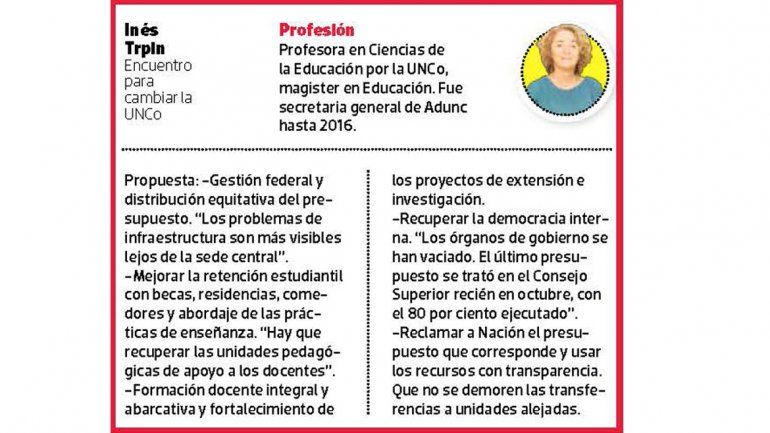 Además, en diciembre se lanzaron dos mujeres: Adriana Giuliani, por Construir UNCo, e Inés Trpin, por Encuentro para Cambiar la UNCo. Después, anunció su candidatura Sergio Bramardi, por Pluralismo e Institucionalidad.