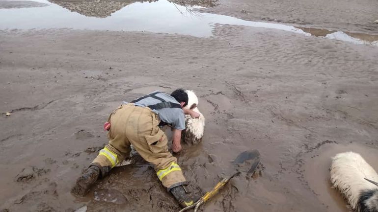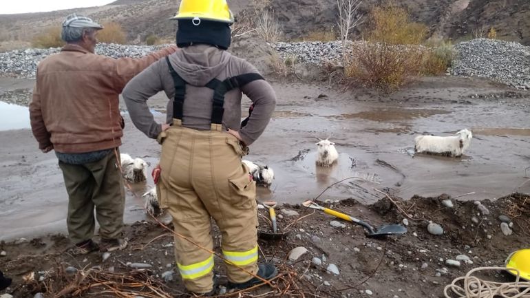 Los Bomberos de Andacollo vivieron ayer una particular intervención tras el llamado de auxilio de un criancero, ya que seis chivas quedaron empantanadas y el hombre no podía retirarlas por sus propios medios.