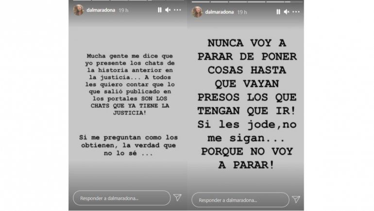 En otras publicaciones, la actriz aclaró que lo que salió publicado en los medios de comunicación “son los chats que tiene la justicia”, y que ella no se los está suministrando a la prensa. Además remarcó que piensa seguir con su postura hasta que se haga justicia. “¡Nunca voy a parar de poner cosas hasta que vayan presos los que tengan que ir! Si les jode, no me sigan... PORQUE NO VOY A PARAR”, concluyó.