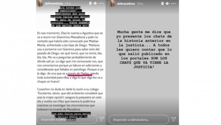 Tras la difusión de las escandalosas conversaciones del cuerpo médico vinculado a los últimos días de Diego Maradona, la hija del astro del fútbol, Dalma Maradona, se hizo eco del acuerdo entre el psicólogo Carlos Díaz y la psiquiatra Agustina Cosachov para ocultarle a Gianinna Maradona que el terapeuta llegó a atender al Diez por recomendación de Matías Morla, enemigo de las hijas de Claudia Villafañe, y no por sugerencia de la médica, tal como le informaron a la mamá de Benjamín Agüero.