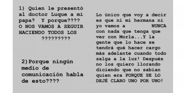 "¿Quién le presentó al doctor (Leopoldo) Luque a mi papá? ¿Y por qué? ¿O nos vamos a seguir haciendo todos los bol...?" ¿Por qué ningún medio de comunicación habla de esto?", escribió la hermana mayor de Gianinna Maradona en un mensaje de Instagram, haciendo alusión al médico de cabecera de su padre, a quien la Justicia aún tiene en la mira no solo por cuestiones médicas, sino por también falsificar su firma.
