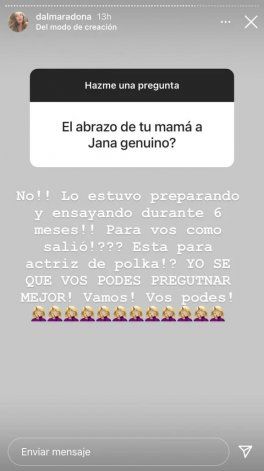 "¿El abrazo de tu mamá a Jana fue genuino?", preguntó un usuario y Dalma estalló. “¡¡No!! ¡¡Lo estuvo preparando y ensayando durante 6 meses!! ¿¿Para vos cómo salió?? ¿Está para actriz de Polka? ¡Yo sé que vos podés preguntar mejor!¡Vamos! ¡Vos podés!”, respondió.