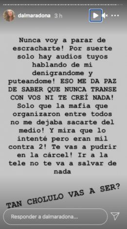 Luego, en otra publicación de Instagram Dalma remarcó: "Nunca voy a parar de escracharte! Por suerte solo hay audios tuyos hablando de mi, denigrándome y puteándome. Eso me da paz, de saber que nunca transé con vos ni te creí nada. Solo que la mafia que organizaron entre todos no me dejaba sacarte del medio. Y mirá que lo intenté, pero eran mil contra 2! Te vas a pudrir en la cárcel. Ir a la tele no te va a salvar de nada", dijo y cerró preguntándose: "¿TAN CHOLULO VAS A SER?".