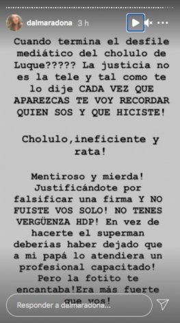 En su descargo, Dalma también trató a Luque de "Cholulo, ineficiente y rata!". Y agregó: "Mentiroso y mierda! Justificándote por falsificar una firma y no fuiste vos solo! No tenés vergüenza, HDP! En vez de hacerte el Superman, deberías haber dejado que a mi papá lo atendiera un profesional capacitado! Pero la fotito te encantaba, era más fuerte que vos".