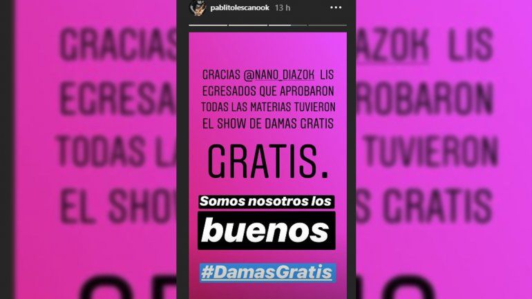 El 24 de junio del año pasado, Pablito tuiteó: “El curso que se reciba y no deje materias pendientes será becado con el show de Damas Gratis”. Cinco meses después, un alumno del Instituto Nordland de Lanús le contestó ese tuit: “Ninguno se llevó materias ni repitió, ¿show gratis en la fiesta de egresados?”.
