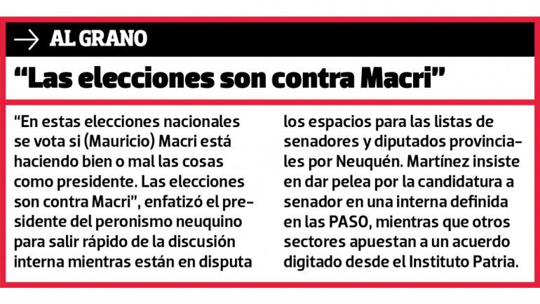 El diputado nacional de Unidad Ciudadana Darío Martínez, presidente del PJ de Neuquén, está enfrascado en dos objetivos prioritarios en la recta final a la definición de las candidaturas del kirchnerismo y sus aliados en Neuquén. Confluir en unas listas que derroten al macrismo, por un lado, y encabezar la boleta para el Senado de la Nación, por otro. “Creo que va a ser una pelea dura, aunque veo que hay compañeros muy eufóricos”, advierte en el inicio de una charla con este diario, en el medio de una jornada cargada de actividades proselitistas y reuniones enmarcadas en la negociación de las candidaturas.