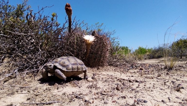 Este jueves viajaron de Villa La Angostura a San Antonio Oeste para poder buscar las distintas especies de este animal. "Y el mismo día que llegamos, que lo intentamos aclimatar al clima y a vegetación, logró encontrar una tortuga hembra que los biólogos de la zona nunca habían identificado", expuso Alex.