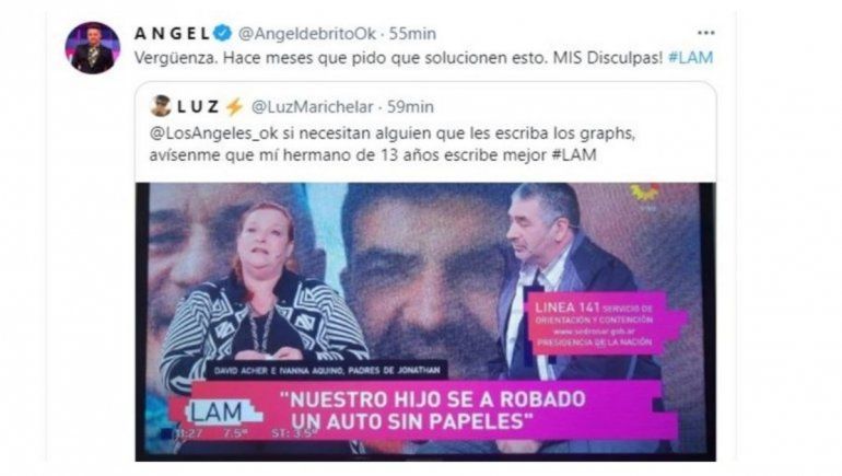 "No hacemos los graphs nosotros. Gerencia #LAM", lanzó enojado De Brito en otro tuit, al replicar otra publicación que criticaba a su envío, al expresar: "O los de #LAM son muy burros o Mica y Cubero esperan un hijo de Jimena Barón. Igual como no sé mucho de la vida de ellos mejor no opino".