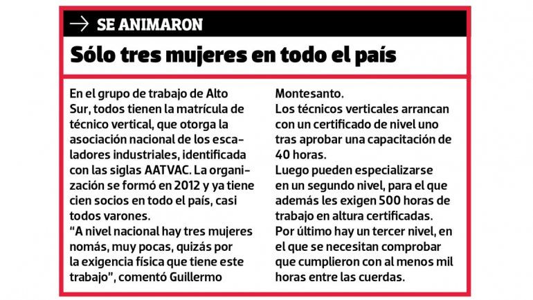 Alto Sur fue una de las primeras empresas de Neuquén en dedicarse a los trabajos verticales, es decir, los servicios de limpieza, mantenimiento o rescate a gran altura, que realizan con un sistema de cuerdas muy parecido al que se usa en escalada deportiva.