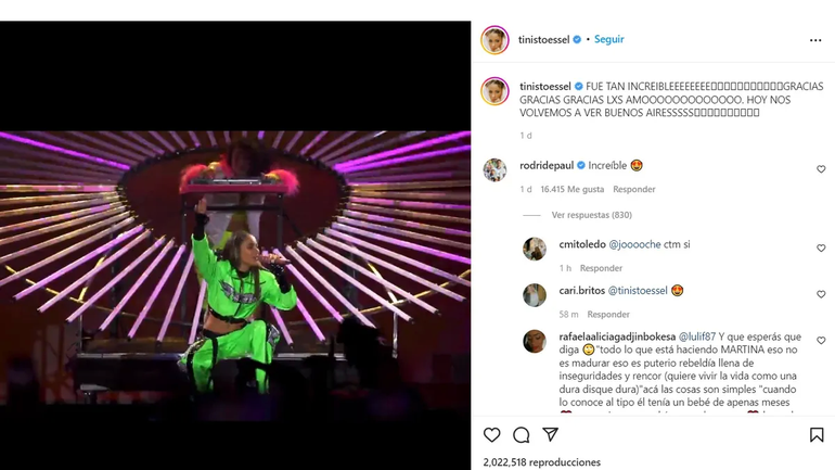 “Fue tan increíble, gracias, gracias, gracias. Lxs amo, hoy nos volvemos a ver Buenos Aires”, precisó Tini el fin de semana sobre su show en el Hipódromo de Palermo que lució colmado.