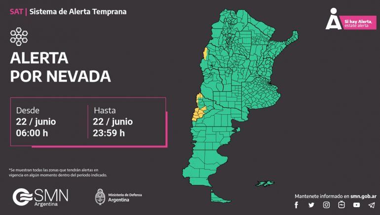 La alerta amarilla rige para todo el sur, la cordillerana, el centro y norte de la provincia. Según pronosticó el SMN, el área será afectada por nevadas de variada intensidad entre la tarde del miércoles y la tarde del jueves.