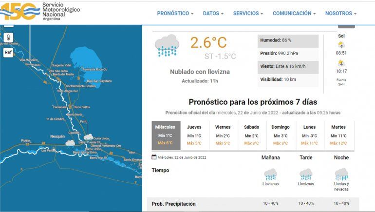 A las 11 el pronóstico daba cuenta del cielo nublado llovizna, una temperatura de 2.6 grados y una sensación térmica de 1.5 grados bajo cero. Según se prevé, la llovizna continuará hasta la tarde. Recién hacia la noche están previstas lluvias y nevadas en la ciudad de Neuquén con probabilidades entre un 10 y un 40%.