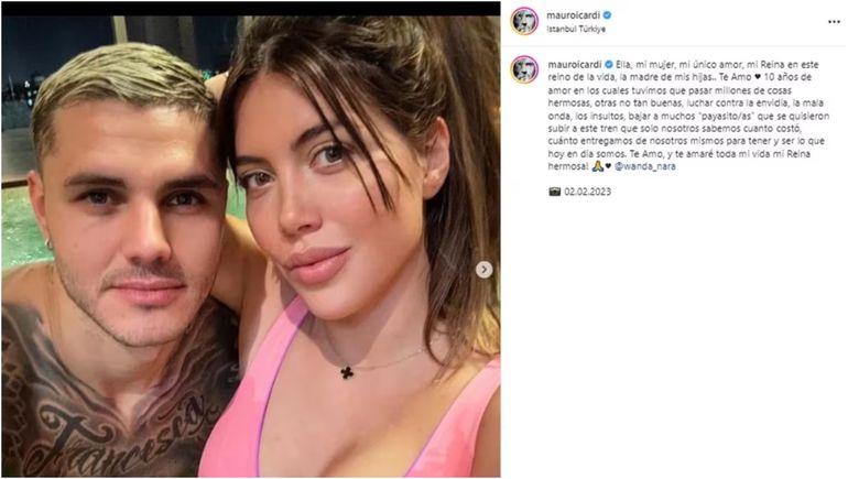 En medio de una supuesta reconciliación, Wanda Nara y Mauro Icardi cumplieron 10 años de casados y por eso, para celebrarlo, el futbolista le dedicó en sus redes sociales una tierna dedicatoria en donde compartió una foto muy reciente de ambos juntos.