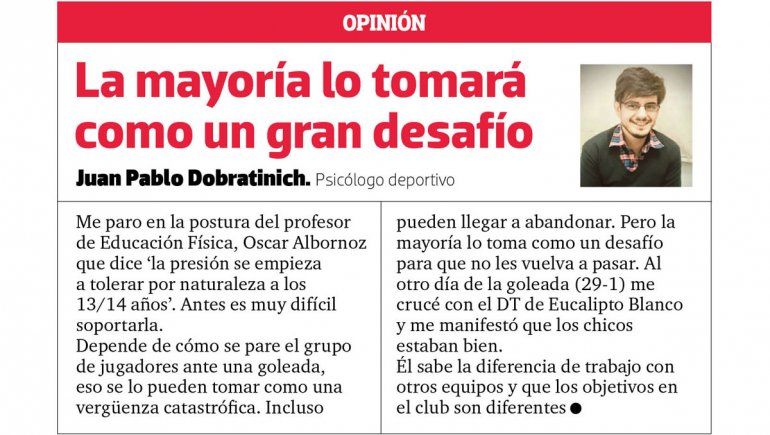 “Creo que estas goleadas perjudican a las formativas y no son necesarias. Esa etapa es de aprendizaje, formación y diversión y un chico con una goleada tan grande, pasa de la alegría al sufrimiento y frustración. A modo personal, nosotros con ese equipo (Maro), optamos por jugar 20 minutos menos”, explicó Eduardo Bustos, presidente de Bicicross. En la misma sintonía opinó Pepe Canale, vicepresidente de Pacífico. “No es bueno pero depende mucho del técnico. Es clara la diferencia en la formación. Yo creo que a Eucalipto no le va a volver a pasar lo mismo porque van a empezar a trabajar de otra manera. Igual creo que partidos así se tienen que terminar antes para que no perjudique la cabeza de los chicos. No tiene sentido”, reflexionó.
