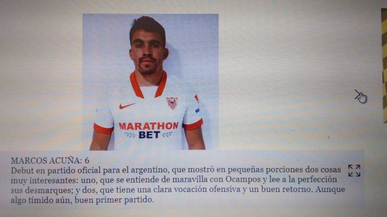 Jugó los noventa minutos, su equipo ganó de visitante y tantos los medios españoles como los hinchas en las redes sociales destacan su labor. El neuquino Marcos Acuña tuvo una gran presentación oficial en el Sevilla de España, que se impuso 3 a 1 como visitante al Cádiz.
