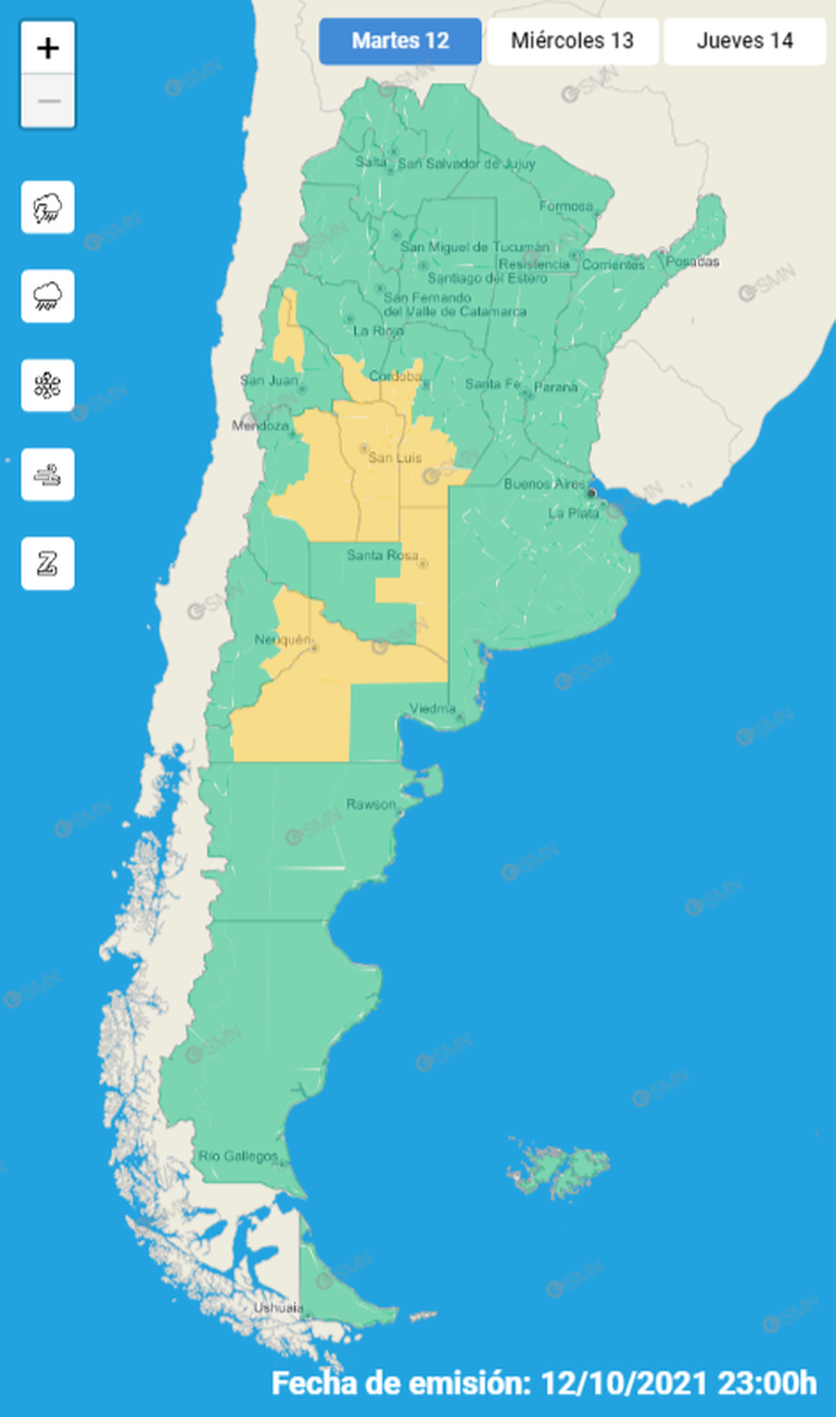 Según detallan, este alerta refiere a "posibles fenómenos meteorológicos con capacidad de daño y riesgo de interrupción momentánea de actividades cotidianas". La probabilidades de precipitaciones rondan entre el 70 y el 100 por ciento, en tanto que la temperatura se mantendrá agradable y las ráfagas llegarán a los 59 kilómetros por hora, con dirección predominante del sudoeste.