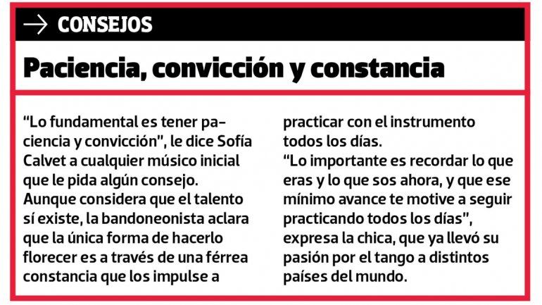 Aunque Sofía puede decir, con orgullo, que vive de lo que más le apasiona, asegura que su principal sacrificio se basa en vivir al revés que el resto del mundo. “No tengo fines de semana y todos los días tocamos hasta tarde”, aclara. Sin embargo, su mente inquieta la lleva a sumar otras actividades para que se derrame su amor por el bandoneón: da clases particulares, coordina una orquesta infantil y, cada vez que puede, se suma a otras agrupaciones para hacerle honor a las pasiones de sus abuelas.