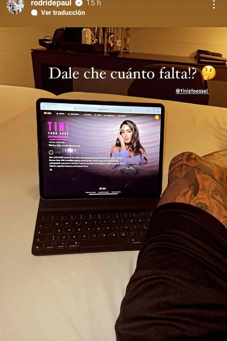 Está en Wembley pero con el corazón en Buenos Aires Rodrigo De Paul... Mientras se prepara en Bilbao junto a la selección argentina para la Finalissima que el próximo miércoles 1 ante Italia, desde el Gran Hotel Domine, donde hace base el combinado nacional, el mediocampista del Atlético Madrid, de 28 años, colocó su notebook sobre la cama y se dispuso a disfrutar el recital por streaming de su novia Tini Stoessel en el Hipódromo de Palermo.
