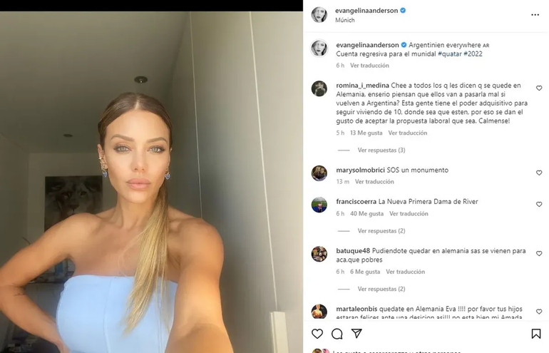 Palpitando el Mundial Qatar 2022, Eva compartió una fotografía para alentar a la Selección argentina luciendo un corset celeste. “Argentinien everywhere (Argentina en todos lados). Cuenta regresiva para el Mundial”, escribió.